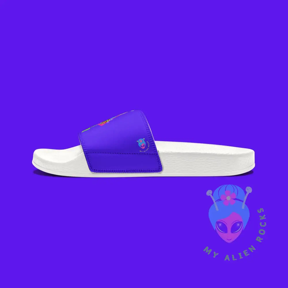 There's nothing cuter than a sandal wearing alien...except maybe a My Alien Rocks sandal wearing Earthling! Rock the summer heat in stellar-style with your favorite My Alien Rocks character(s) on these sassy-slide-sandals for women. Made with PU outsoles and an edge-to-edge artistic strap that will never peel, crack, or fade, these sandals feature high-quality ergonomic soles that help cradle and comfort the foot (you're welcome, Earthlings)! Now, it's not galactic news that sandals are the billboard of the feet...but it is galactic news that this particular foot billboard comes in our signature electric violet color with a rendering of our neon-obsessed-turn-up-my-jam-man alien, Topher! (Meet Topher — and the rest of our rockin' family — on social media @myalienrocks)!