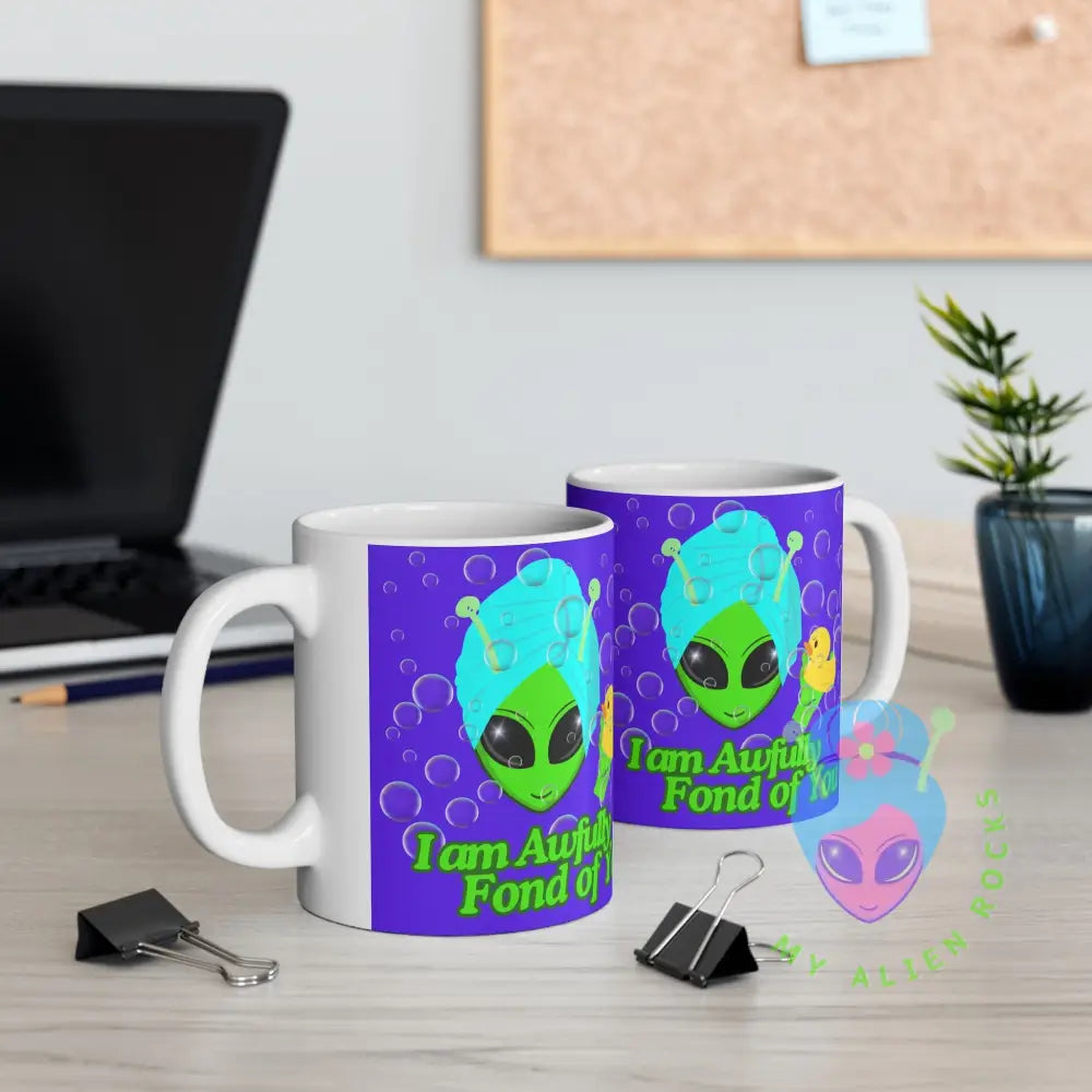 Bubble Bath Alien with Rubber Ducky - I Am Awfully Fond of You - Electric Violet - White - Ceramic Mug, (11oz, 15oz)