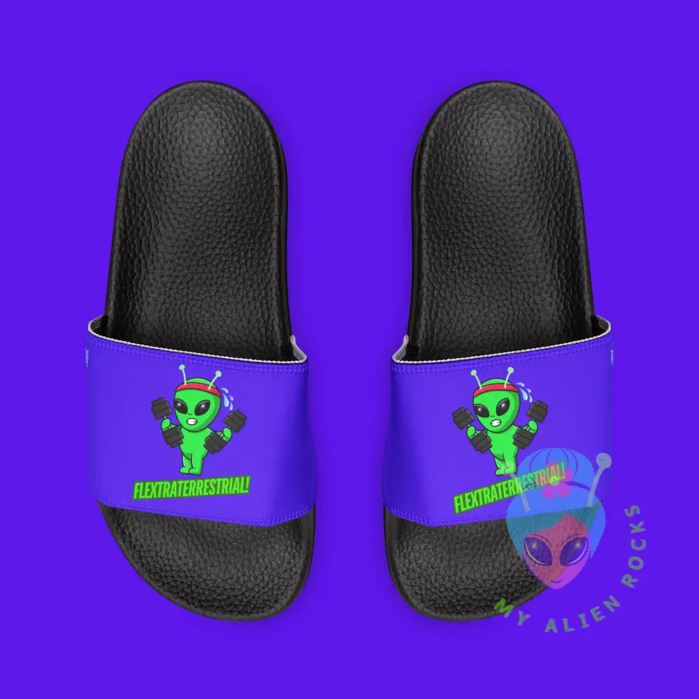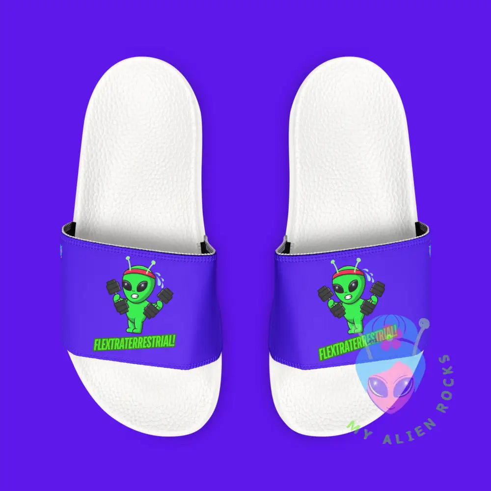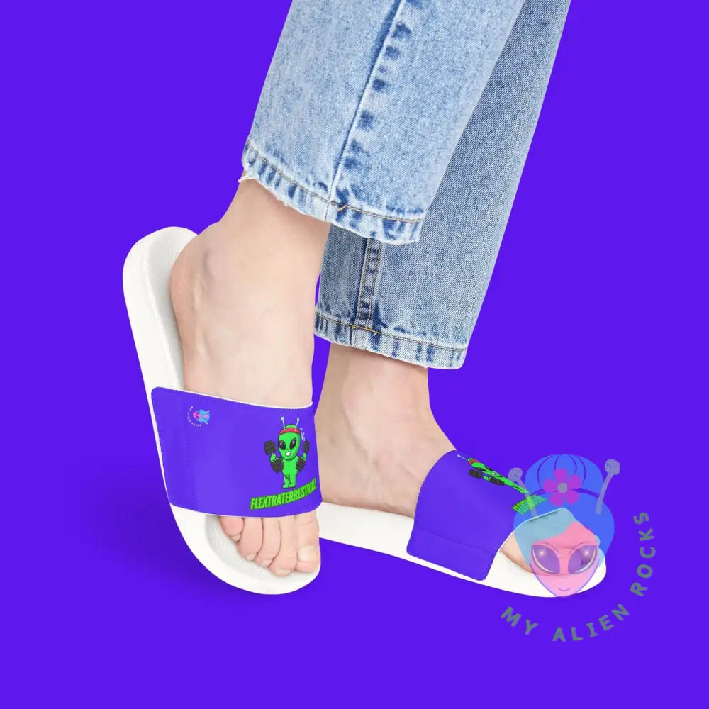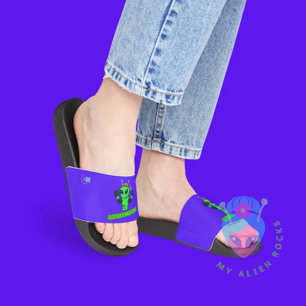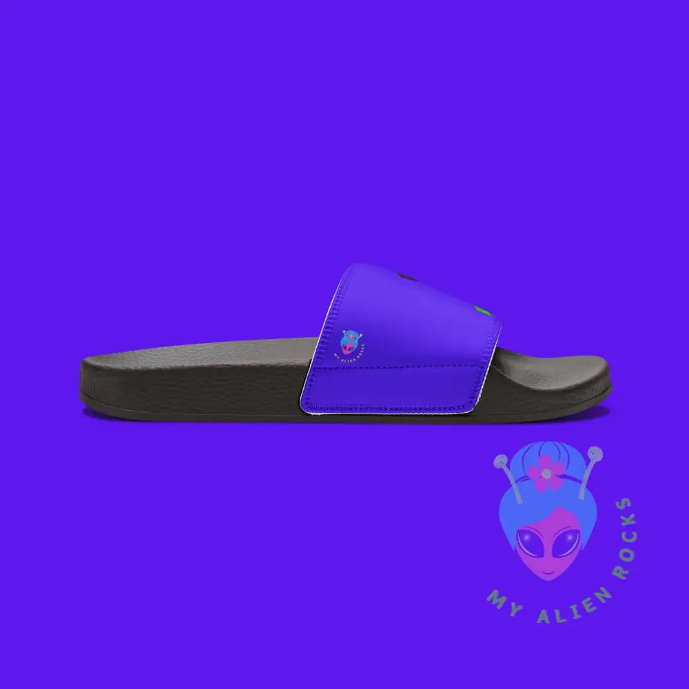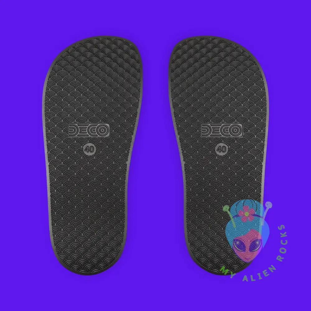 There's nothing cuter than a sandal wearing alien...except maybe a My Alien Rocks sandal wearing Earthling! Rock the summer heat in stellar-style with your favorite My Alien Rocks character(s) on these sassy-slide-sandals for women. Made with PU outsoles and an edge-to-edge artistic strap that will never peel, crack, or fade, these sandals feature high-quality ergonomic soles that help cradle and comfort the foot (you're welcome, Earthlings)! Now, it's not galactic news that sandals are the billboard of the feet...but it is galactic news that this particular foot billboard comes in our signature electric violet color with a rendering of our pecs-flexin'-bigger-than-a-Texan alien, Spec! (Meet Spec — and the rest of our rockin' family — on social media @myalienrocks)!