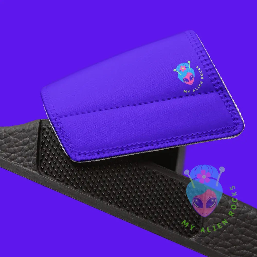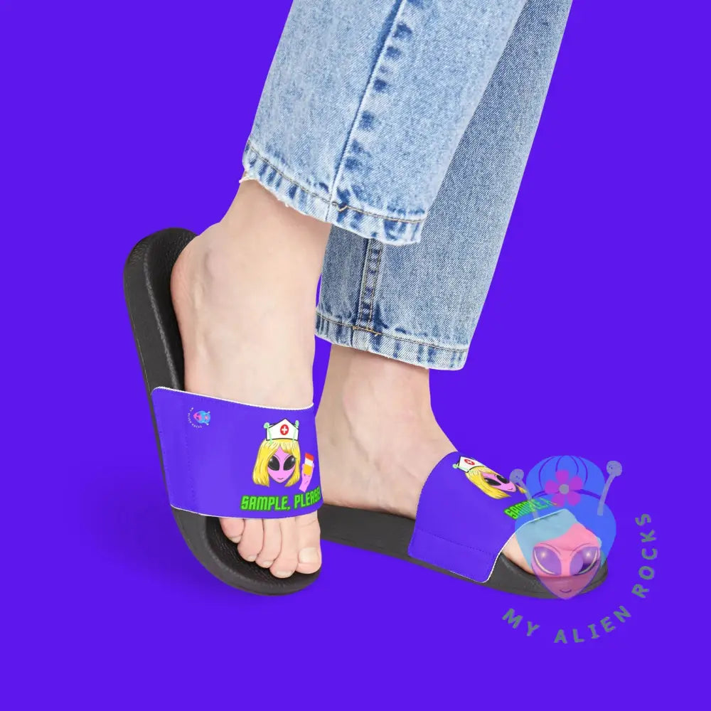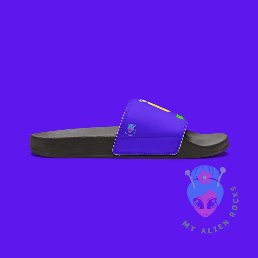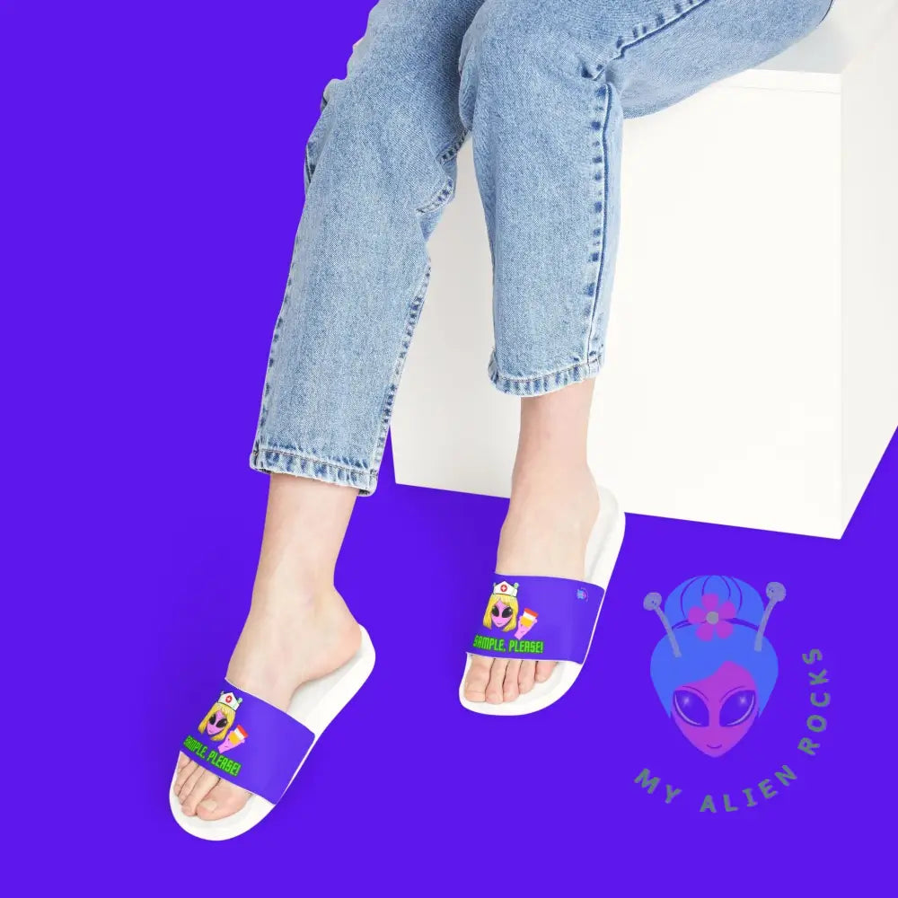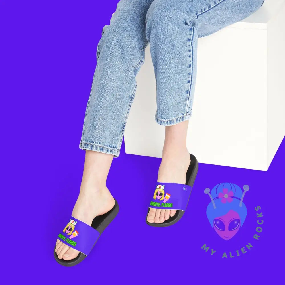 There's nothing cuter than a sandal wearing alien...except maybe a My Alien Rocks sandal wearing Earthling! Rock the summer heat in stellar-style with your favorite My Alien Rocks character(s) on these sassy-slide-sandals for women. Made with PU outsoles and an edge-to-edge artistic strap that will never peel, crack, or fade, these sandals feature high-quality ergonomic soles that help cradle and comfort the foot (you're welcome, Earthlings)! Now, it's not galactic news that sandals are the billboard of the feet...but it is galactic news that this particular foot billboard comes in our signature electric violet color with a rendering of our please-don't-go-over-the-fill-line-enforcin'-specimen-collectin' alien, Mildred! (Meet Mildred — and the rest of our rockin' family — on social media @myalienrocks)!