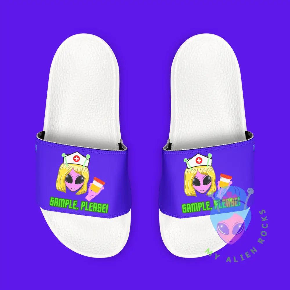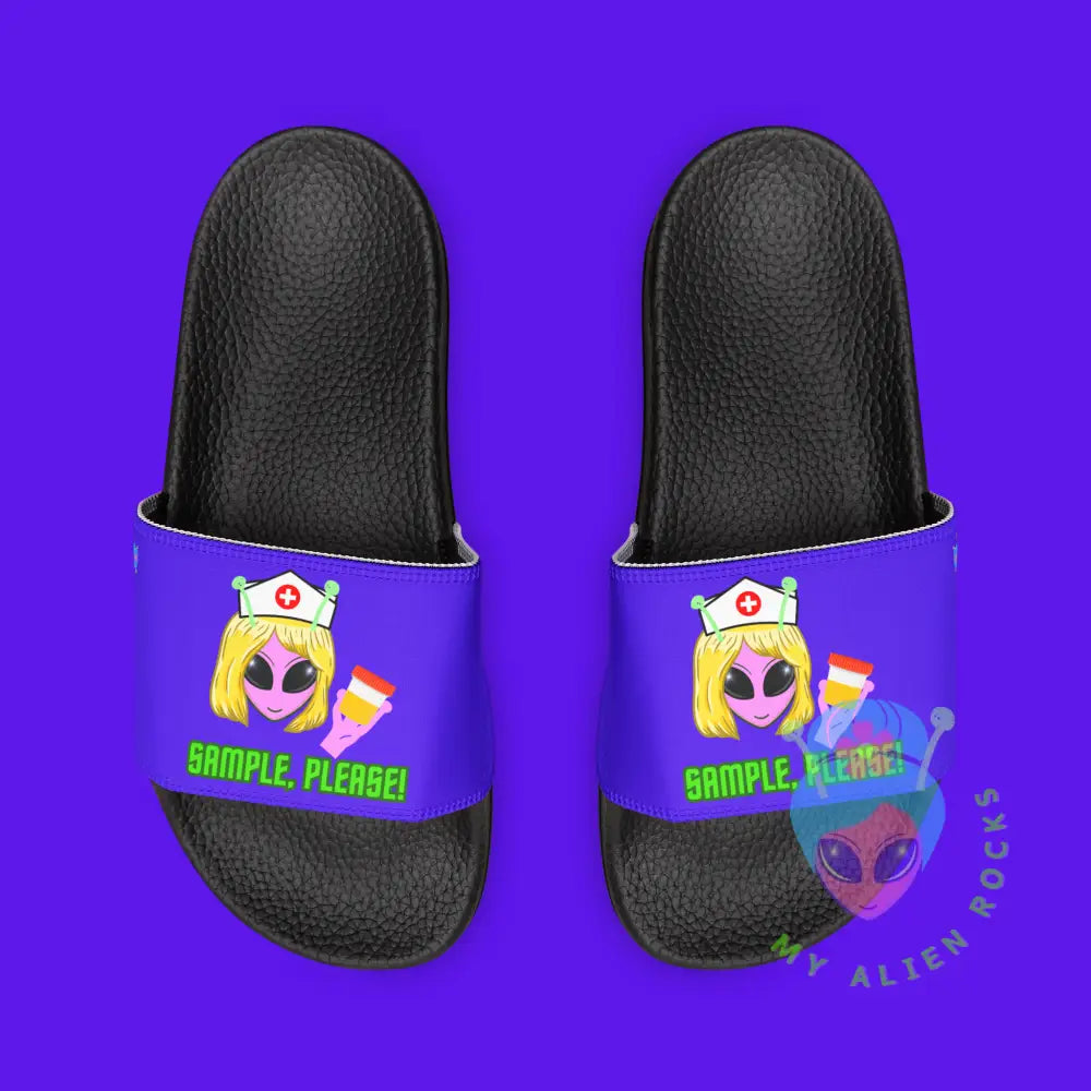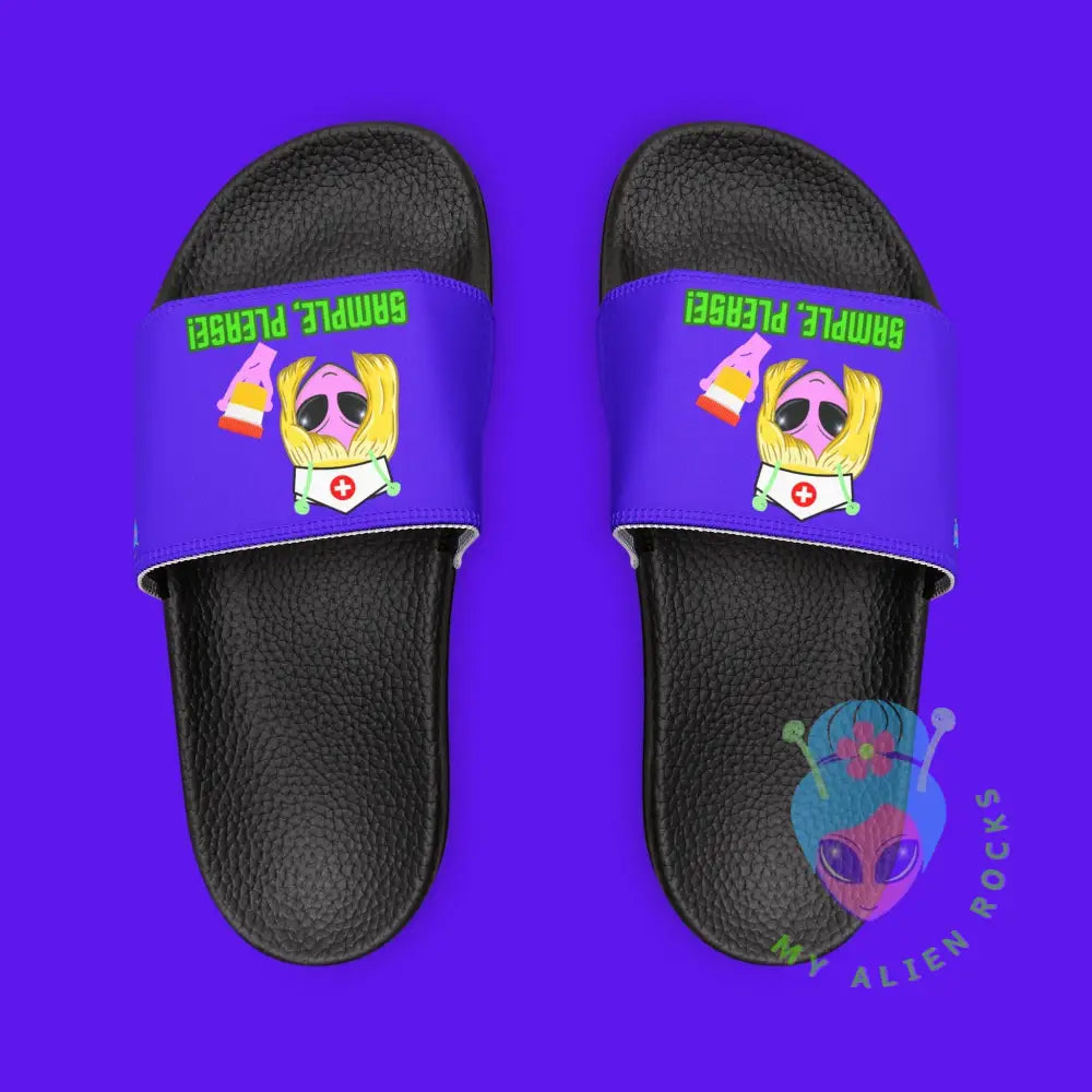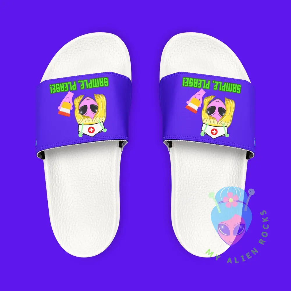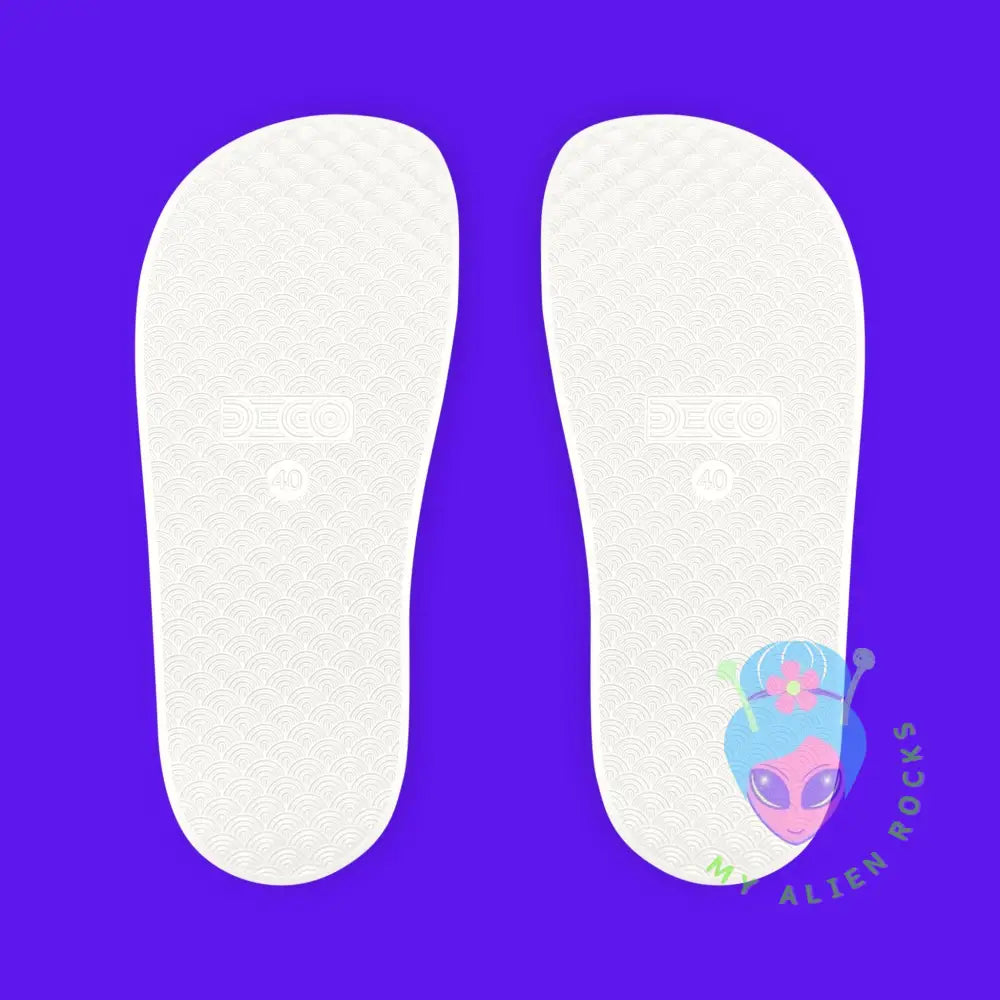 There's nothing cuter than a sandal wearing alien...except maybe a My Alien Rocks sandal wearing Earthling! Rock the summer heat in stellar-style with your favorite My Alien Rocks character(s) on these sassy-slide-sandals for women. Made with PU outsoles and an edge-to-edge artistic strap that will never peel, crack, or fade, these sandals feature high-quality ergonomic soles that help cradle and comfort the foot (you're welcome, Earthlings)! Now, it's not galactic news that sandals are the billboard of the feet...but it is galactic news that this particular foot billboard comes in our signature electric violet color with a rendering of our please-don't-go-over-the-fill-line-enforcin'-specimen-collectin' alien, Mildred! (Meet Mildred — and the rest of our rockin' family — on social media @myalienrocks)!