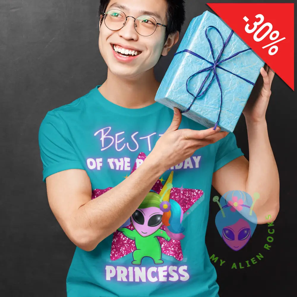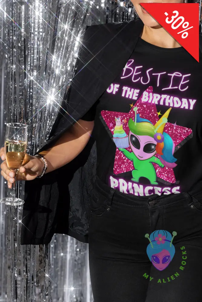 Are you the proud best friend of an out-of-this-world-stellar-far-out birthday princess? You are?! Yes, you are! And this epic "Bestie of the Birthday Princess" t-shirt is just for YOU, best-of-the-best! (See, it even has your name on it)! Now, it's not galactic news that there is something extra-special about being the best friend of a birthday-alien-unicorn hybrid...but it is galactic news that you can now showcase that proud fact with your very own My Alien Rocks t-shirt, which features a rendering of our sparkly-stardustly-if-you're-going-to-be-a-unicorn-be-an-alien-unicorn...alien, Honey! (Meet Honey — and the rest of our rockin' family — on social media @myalienrocks)!