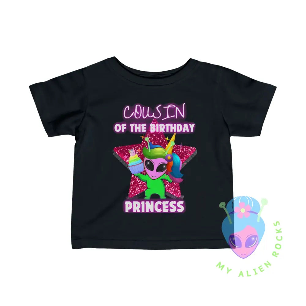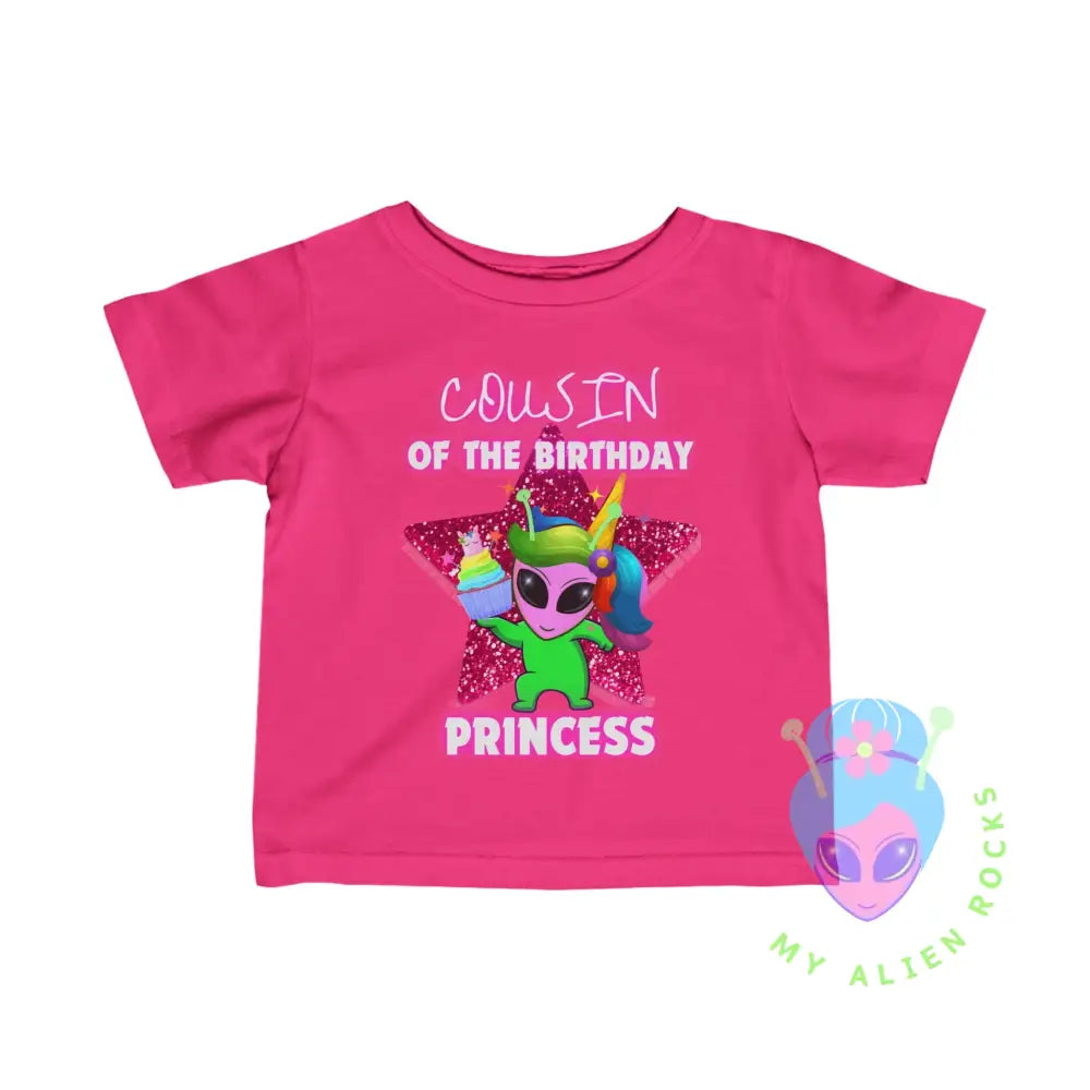 Are you the proud cousin of an out-of-this-world-stellar-far-out birthday princess? You are?! Yes, you are! And this epic "Cousin of the Birthday Princess" t-shirt is just for YOU, cuz! (See, it even has your name on it)! Striking the perfect balance between comfort for younglings and toddler-specific durability, this infant fine jersey tee delivers on all fronts. Featuring side seams to better support the garment’s shape, these tees also come with ribbed knitting for improved durability and taped shoulders for a breezy fit. Solid colors are 100% soft ring-spun cotton. Now, it's not galactic news that there is something extra-special about being the cousin of a birthday-alien-unicorn hybrid...but it is galactic news that you can now showcase that proud fact with your very own My Alien Rocks t-shirt, which features a rendering of our sparkly-stardustly-if-you're-going-to-be-a-unicorn-be-an-alien-unicorn...alien, Honey! (Meet Honey — and the rest of our rockin' family — on social media @myalienrocks)!