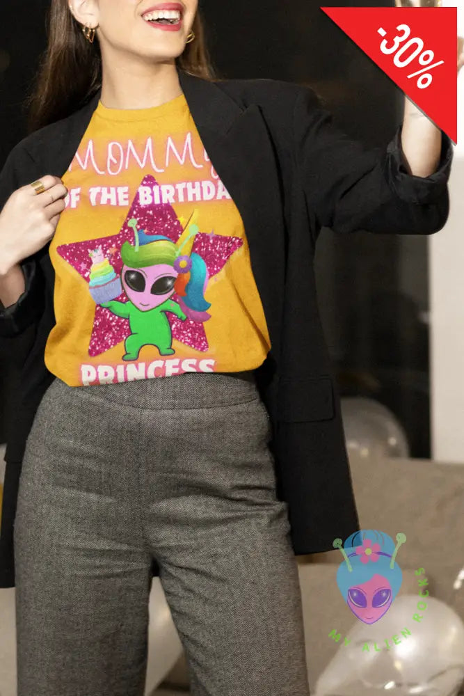 Are you the proud mommy of an out-of-this-world-stellar-far-out birthday princess? You are?! YES, you are! And this epic "Mommy of the Birthday Princess" t-shirt is just for YOU, mommy! (See, it even has your name on it)! Now, it's not galactic news that there is something extra-special about being the mommy of a birthday-alien-unicorn hybrid...but it is galactic news that you can now showcase that proud fact with your very own My Alien Rocks t-shirt, which features a rendering of our sparkly-stardustly-if-you're-going-to-be-a-unicorn-be-an-alien-unicorn...alien, Honey! (Meet Honey — and the rest of our rockin' family — on social media @myalienrocks)!