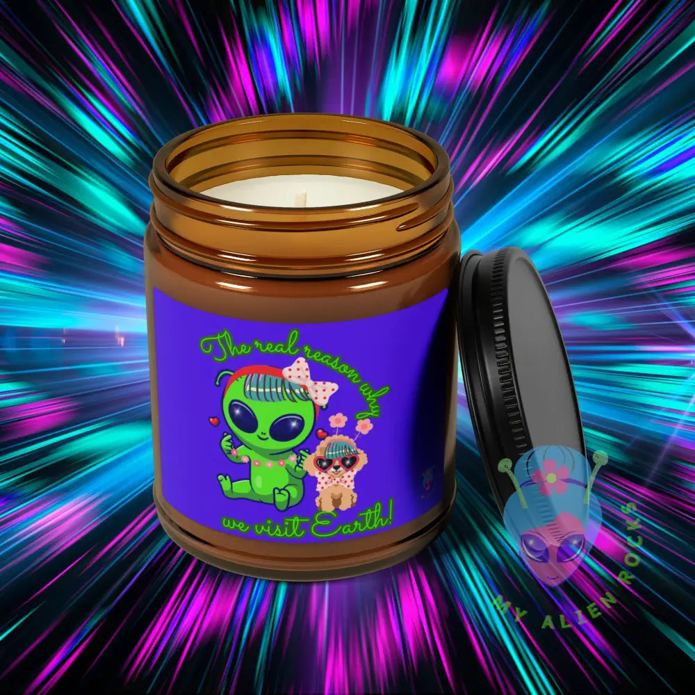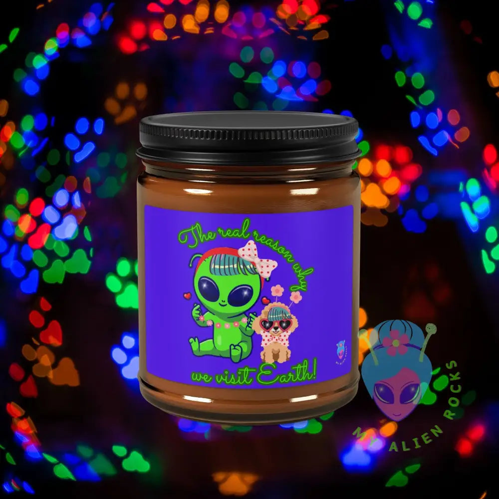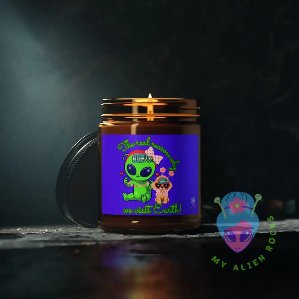 Why Aliens Visit Earth - Dogs - Electric Violet - 9 oz Scented Soy Candle (Amber Jar)