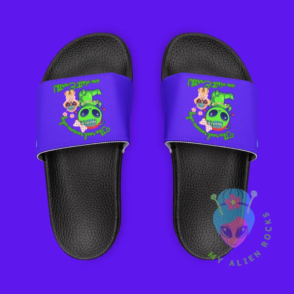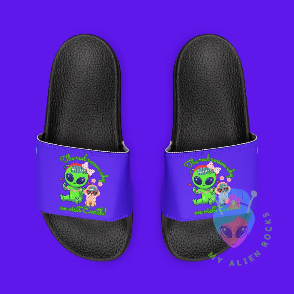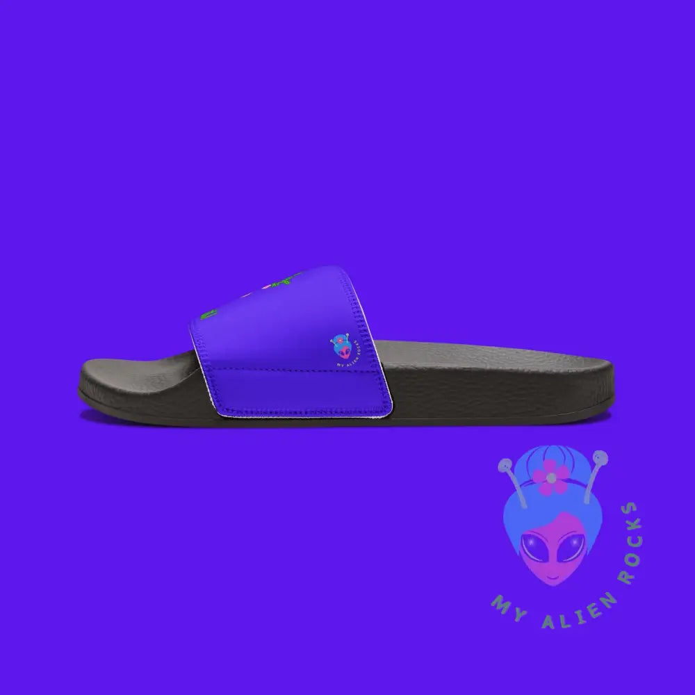 There's nothing cuter than a sandal wearing alien...except maybe a My Alien Rocks sandal wearing Earthling! Rock the summer heat in stellar-style with your favorite My Alien Rocks character(s) on these sassy-slide-sandals for women. Made with PU outsoles and an edge-to-edge artistic strap that will never peel, crack, or fade, these sandals feature high-quality ergonomic soles that help cradle and comfort the foot (you're welcome, Earthlings)! Now, it's not galactic news that sandals are the billboard of the feet...but it is galactic news that this particular foot billboard comes in our signature electric violet color with a rendering of our dog-fur-equals-glitter-and-everyday-is-doggone-pawsome-when-your-dog-is-your-Valentine juvenile alien, Katrina! (Meet Katrina — and the rest of our rockin' family — on social media @myalienrocks)!