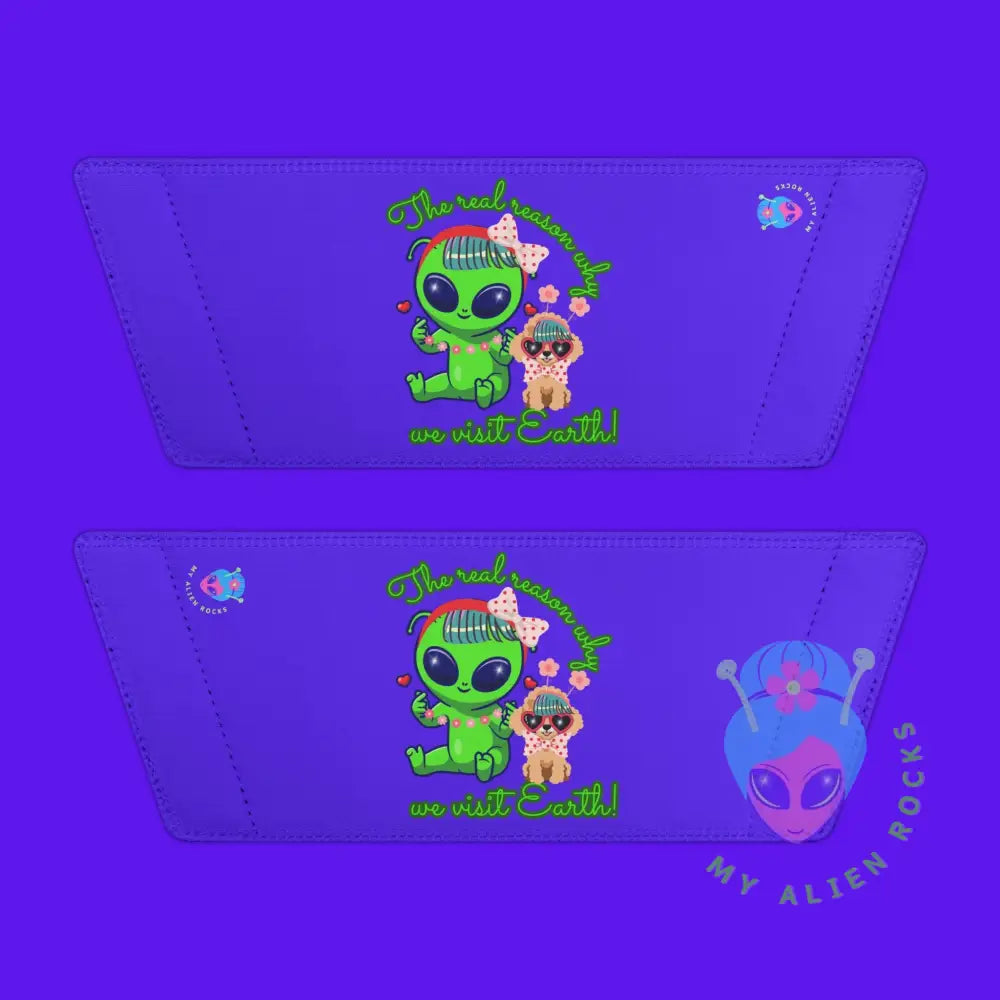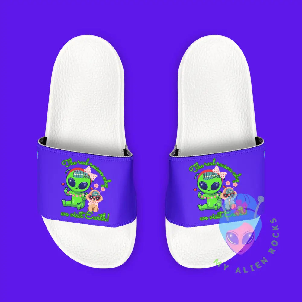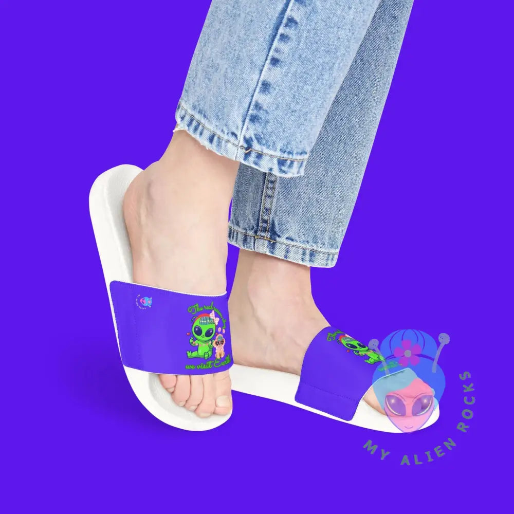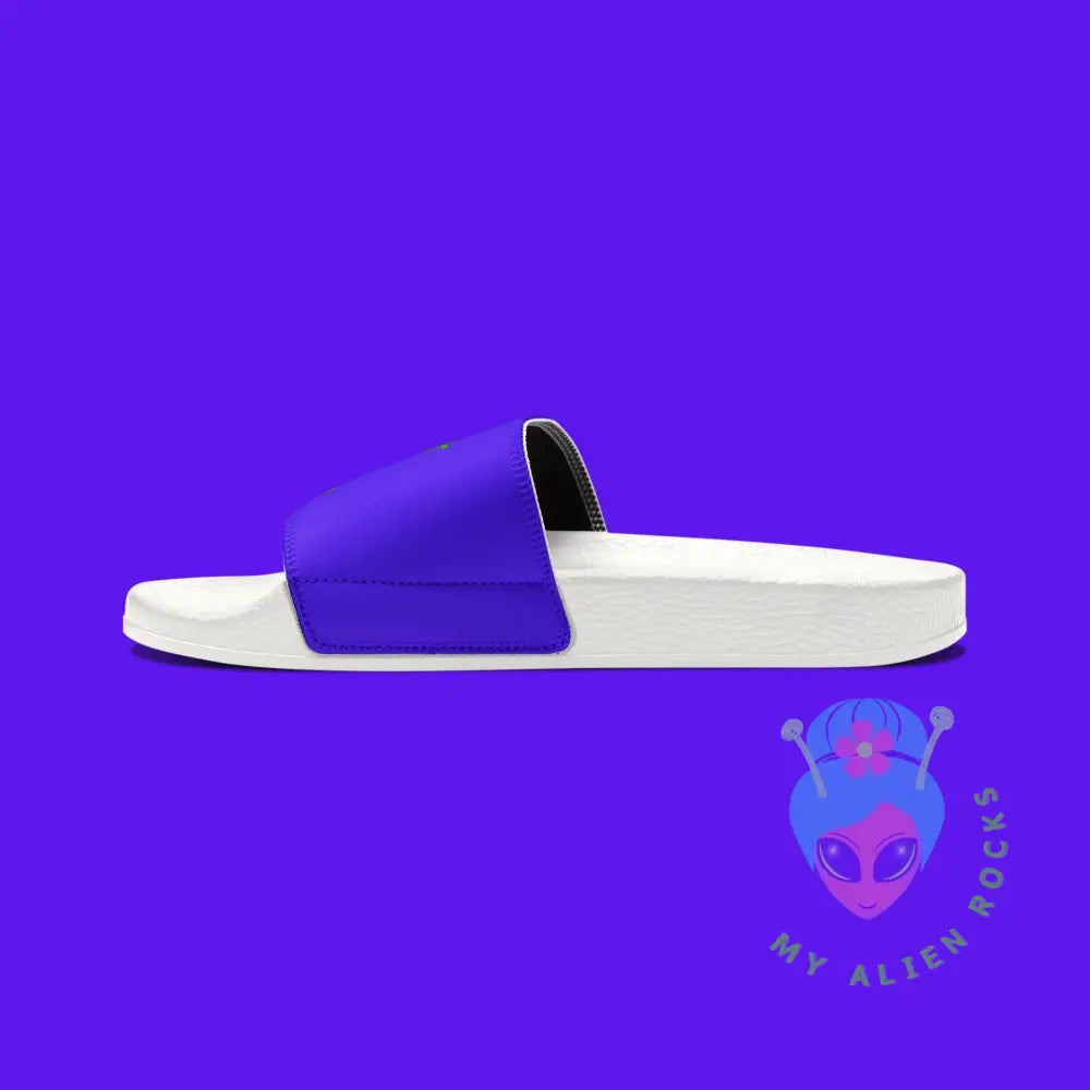 There's nothing cuter than a sandal wearing alien...except maybe a My Alien Rocks sandal wearing Earthling! Rock the summer heat in stellar-style with your favorite My Alien Rocks character(s) on these sassy-slide-sandals for women. Made with PU outsoles and an edge-to-edge artistic strap that will never peel, crack, or fade, these sandals feature high-quality ergonomic soles that help cradle and comfort the foot (you're welcome, Earthlings)! Now, it's not galactic news that sandals are the billboard of the feet...but it is galactic news that this particular foot billboard comes in our signature electric violet color with a rendering of our dog-fur-equals-glitter-and-everyday-is-doggone-pawsome-when-your-dog-is-your-Valentine juvenile alien, Katrina! (Meet Katrina — and the rest of our rockin' family — on social media @myalienrocks)!