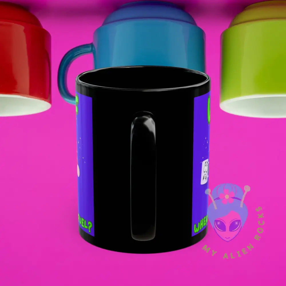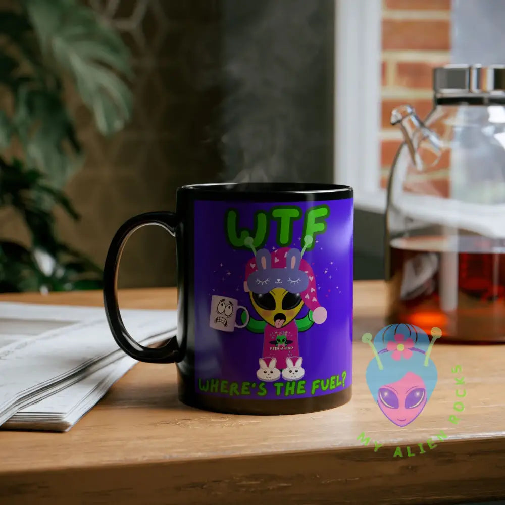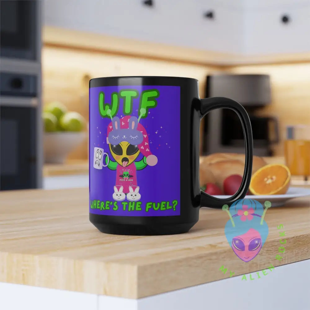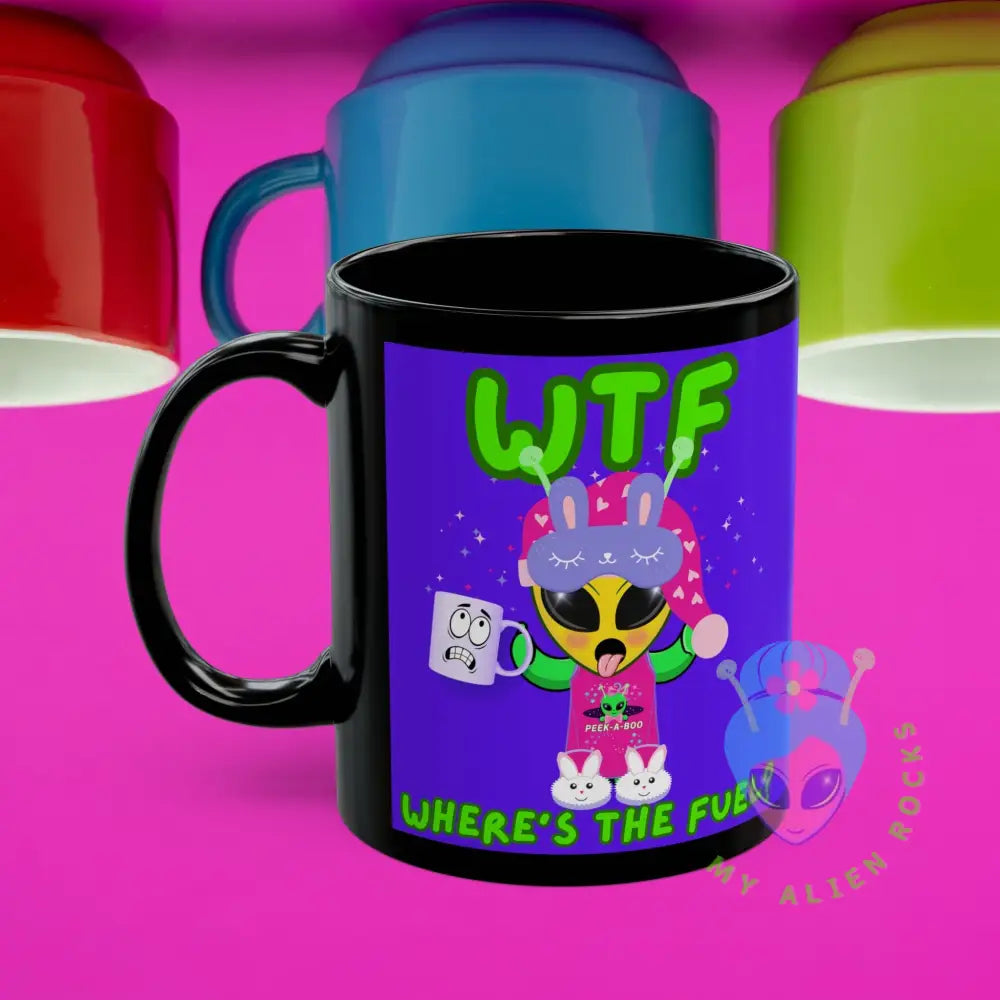 WTF Alien - Coffee Alien - Where's the Fuel? - Electric Violet - Black Mug (11oz, 15oz)